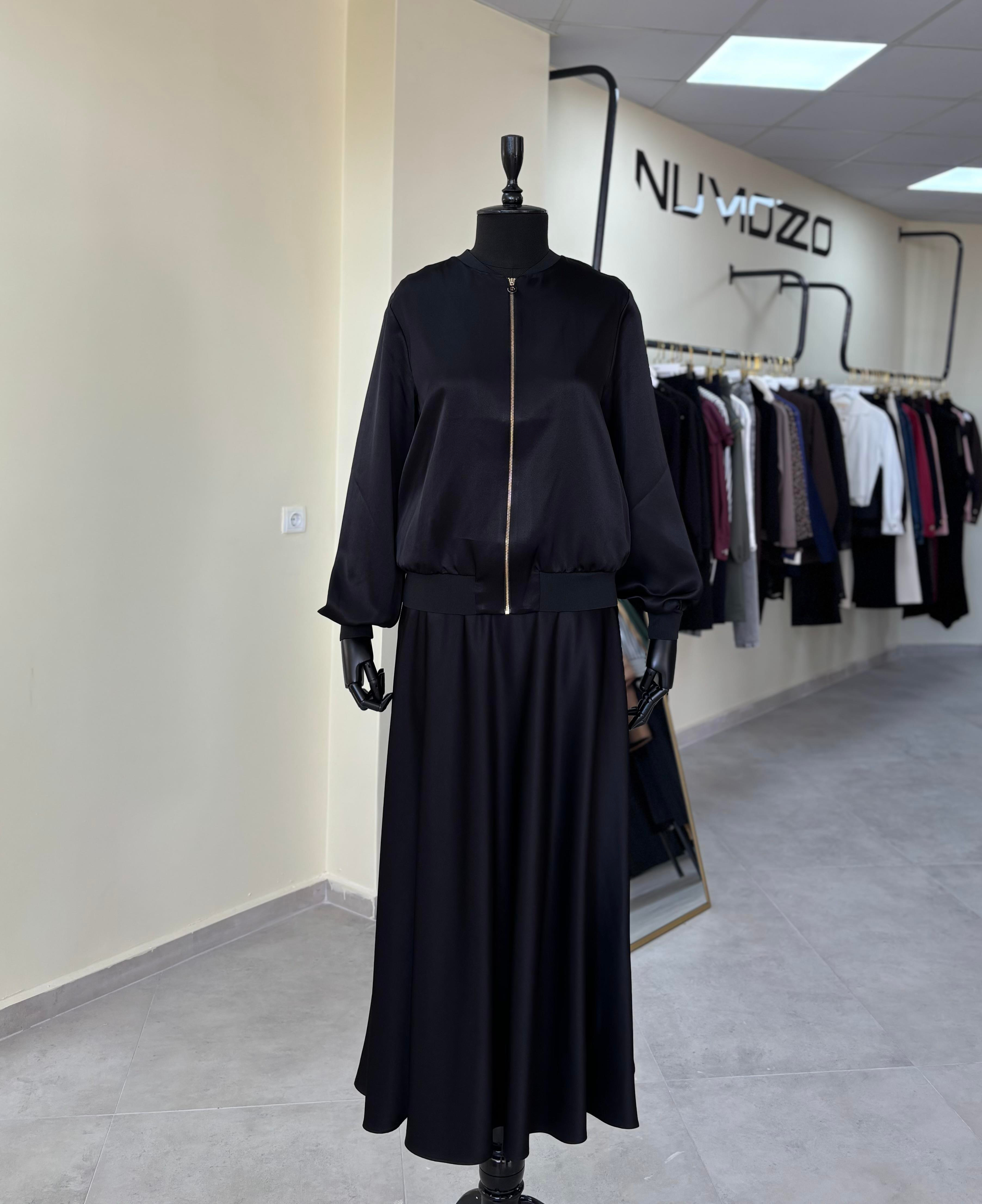 Yandan Fermuarlı Yüksek Bel Grogren Detaylı Saten Regular Siyah Midi Etek