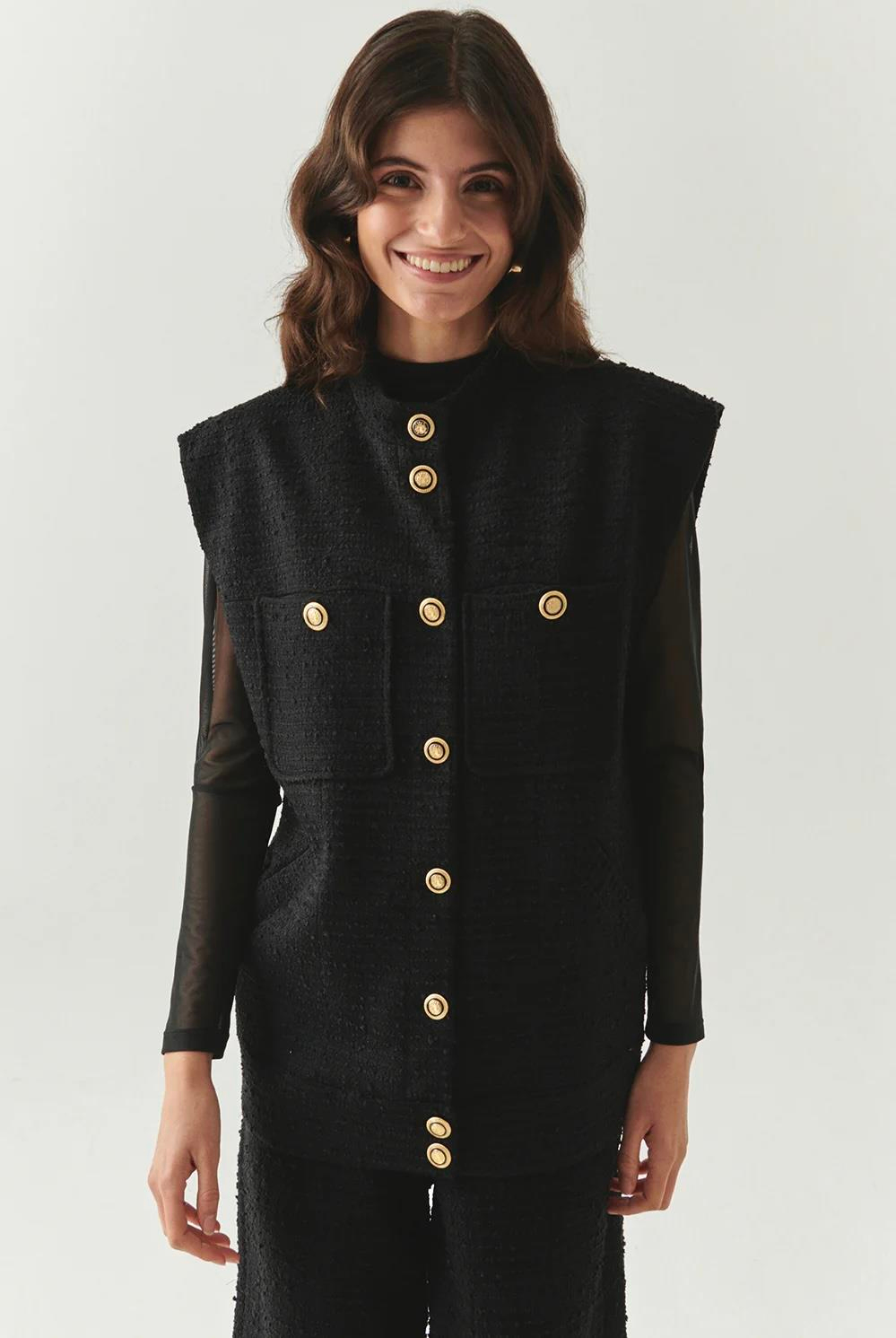 Düğme Detaylı Cepli Regular Dokuma Siyah Yelek